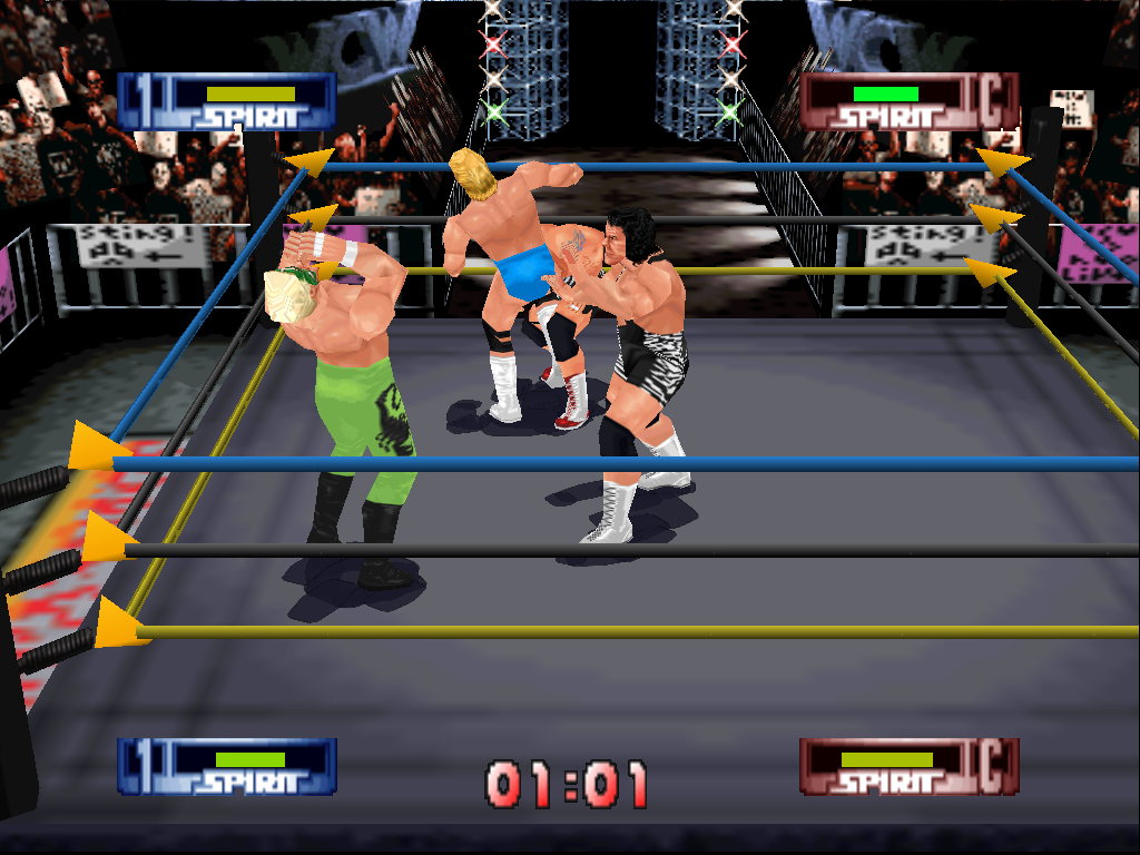 I started off this week with one goal – Blue/Black/Yellow ring ropes. I didn’t want to field future comments of “why are the ropes insert color here“, so it was a number one priority for this ROM hack’s aesthetic. After a few tests, I successful coding hacked in to give me the right colors across all instances – intro video, entrance, wrestling, championship. He’s a screenshot from an early Luger & Sting vs. Steiner Brothers demo match.